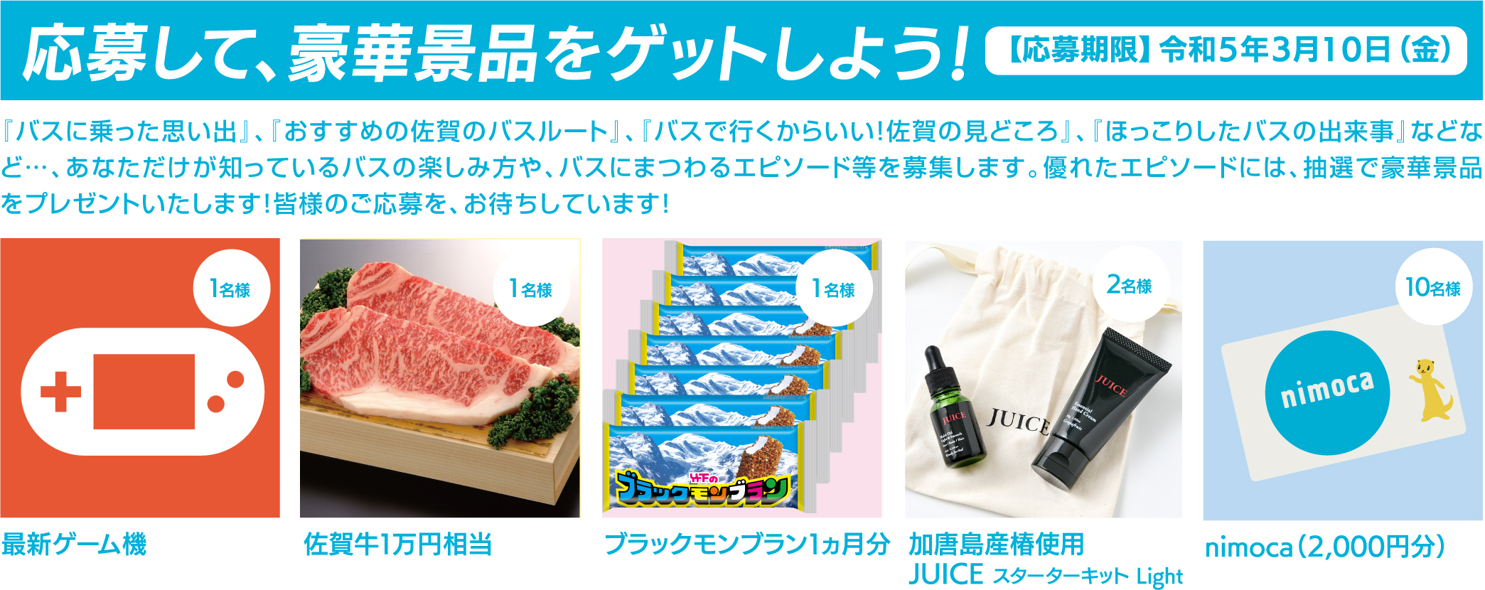 ※nimocaカードは、利用可能額1,500円+デポジット500円分のチャージ済カードのお渡しになります。 ※ご記入いただいた個人情報は、本アンケートの賞品発送業務以外に使用することはありません。 ※当選発表は、賞品の発送をもって代えさせていただきますが、必要な場合は、ご連絡させていただくことがあります。 ※応募川柳や応募者の年代(例:30代)は、佐賀県ホームページ等で公開させていただくことがあります。予めご了承ください。